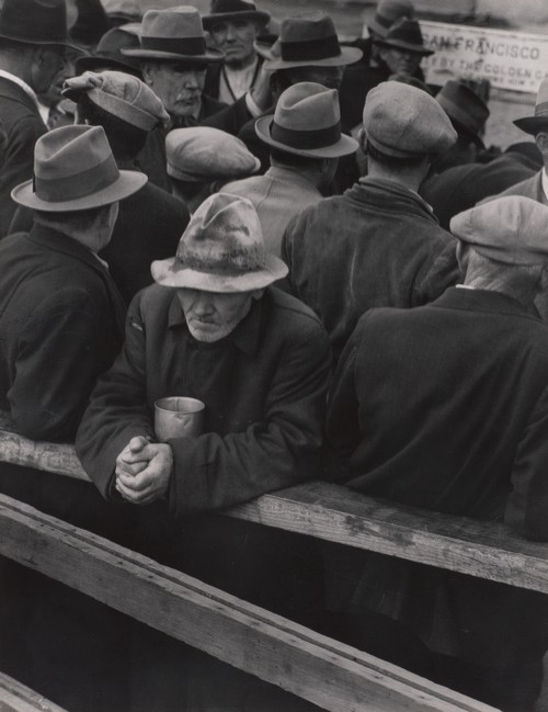 Een straatbeeld dat kenmerkend was voor deze tijd in veel Amerikaanse steden: rijen met werkloze mannen wachtend op iets te eten van een gaarkeuken. Wat opvalt is de man in het midden, hij staat namelijk met zijn rug naar de anderen toe. Geïsoleerd en wachtend met een tinnen beker staat hij alleen. En het is waarschijnlijk deze foto geweest waardoor het werk en het talent van Dorothea Lange opgemerkt werd door de overheid. De foto werd namelijk afgedrukt in verschillende media en wist hiermee een groot bereik onder fotografen en politici te krijgen.